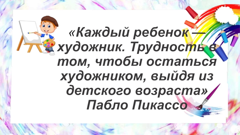 Слайд 40«Каждый ребенок — художник. Трудность в том, чтобы остаться художником, выйдя
