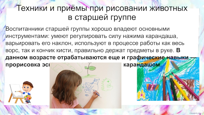 хорошо владеют основными инструментами: умеют регулировать силу нажима карандаша, варьировать его наклон, используют в процессе работы как весь ворс, так и кончик кисти, правильно держат предметы в руке. В данном возрасте отрабатываются еще и графические навыки — прорисовка эскиза животного простым карандашом.