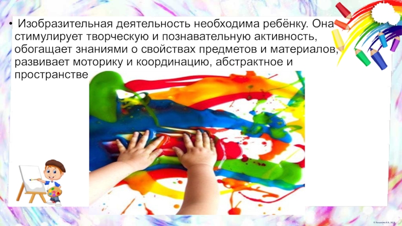 Слайд 2 Изобразительная деятельность необходима ребёнку. Она стимулирует творческую и познавательную активность,