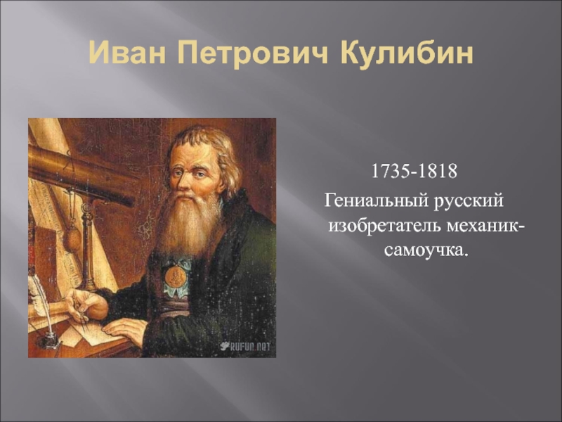 Иван Петрович Кулибин1735-1818Гениальный русский изобретатель механик-самоучка.