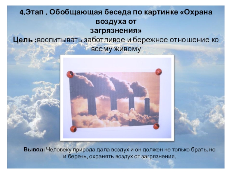 Вывод: Человеку природа дала воздух и он должен не только брать, но и беречь, охранять воздух от загрязнения.