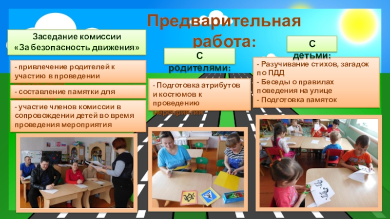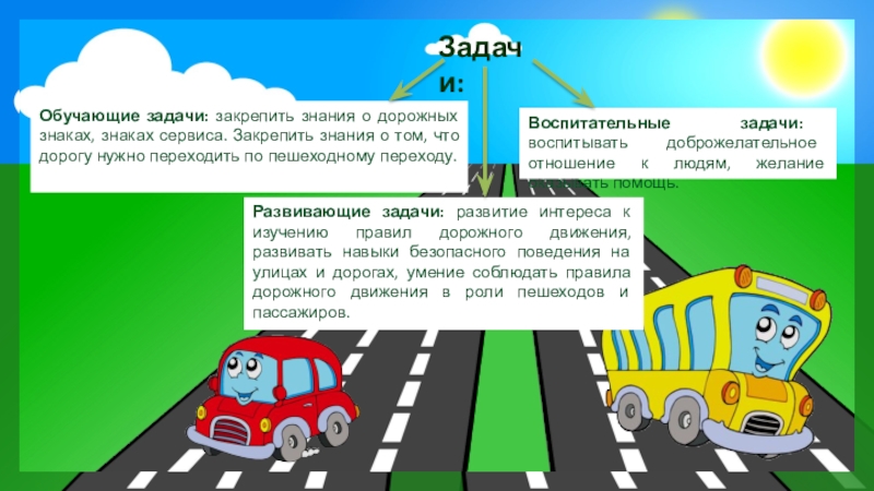 Развивающие задачи: развитие интереса к изучению правил дорожного движения, развивать навыки безопасного поведения на улицах и дорогах, умение соблюдать правила дорожного движения в роли пешеходов и пассажиров.