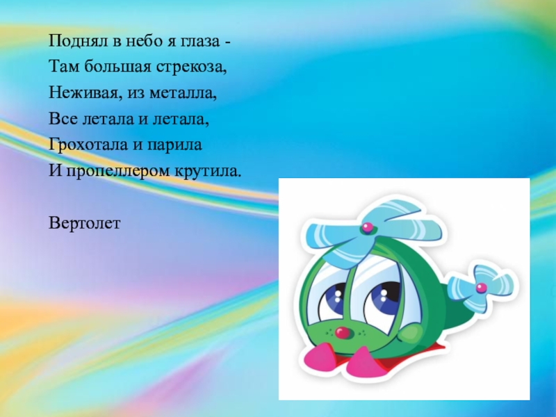 Поднял в небо я глаза -Там большая стрекоза,Неживая, из металла,Все летала и летала,Грохотала и парилаИ пропеллером крутила.