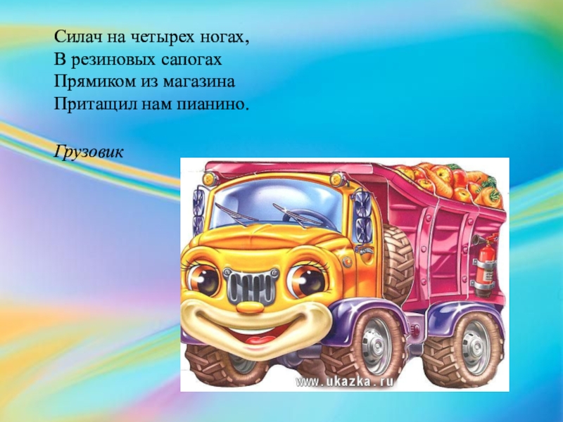 Силач на четырех ногах,  В резиновых сапогах  Прямиком из магазина  Притащил нам пианино.  Грузовик