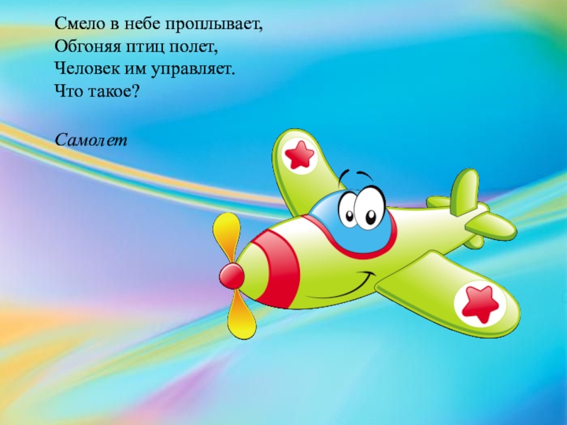 Слайд 4Смело в небе проплывает,  Обгоняя птиц полет,  Человек им управляет.  Что такое?