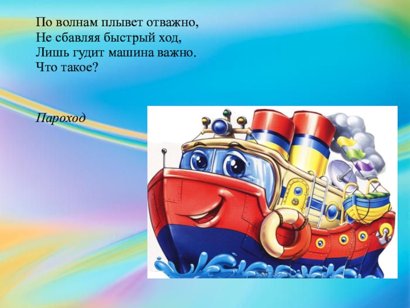По волнам плывет отважно,  Не сбавляя быстрый ход,  Лишь гудит машина важно.  Что такое?  Пароход