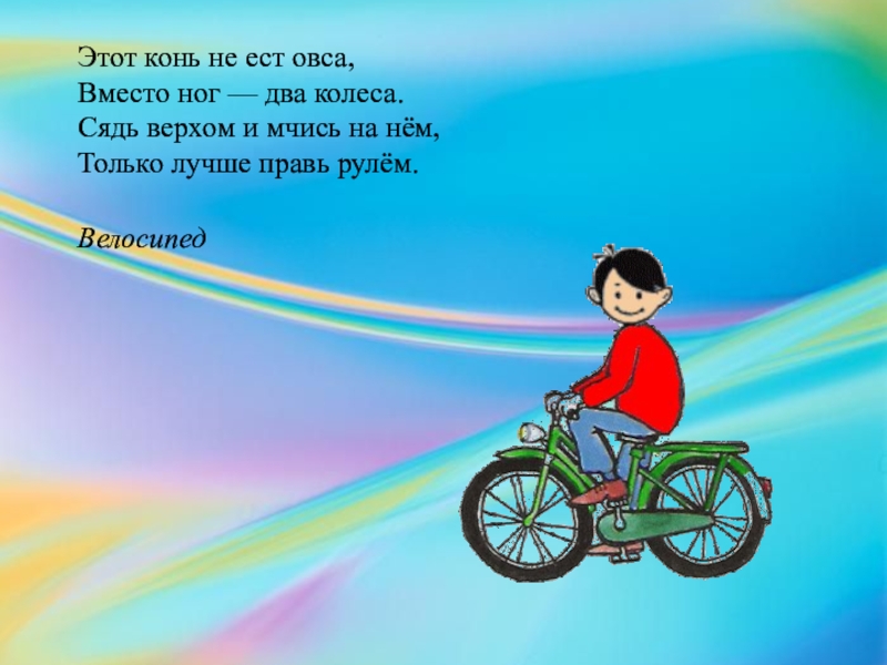 Слайд 5Этот конь не ест овса,  Вместо ног — два колеса.  Сядь верхом и