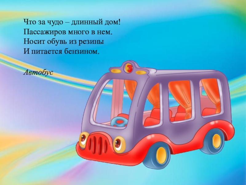 Что за чудо – длинный дом!  Пассажиров много в нем.  Носит обувь из резины  И питается бензином. Автобус