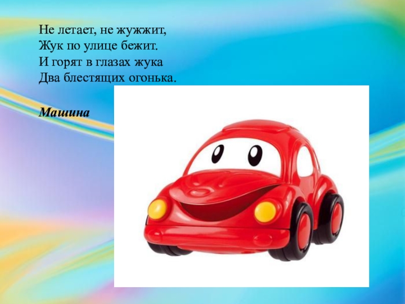 Не летает, не жужжит,  Жук по улице бежит.  И горят в глазах жука  Два блестящих огонька.  Машина