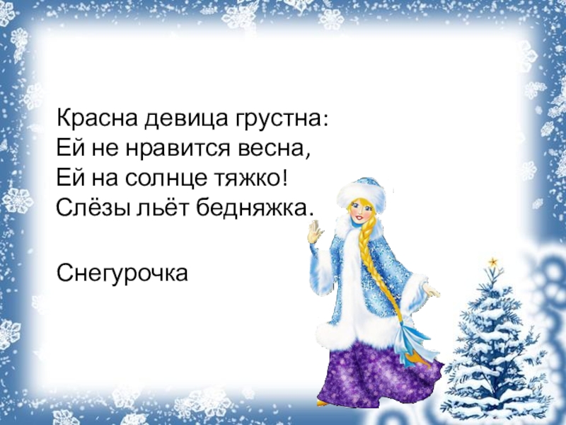 Красна девица грустна: Ей не нравится весна, Ей на солнце тяжко! Слёзы льёт бедняжка. Снегурочка