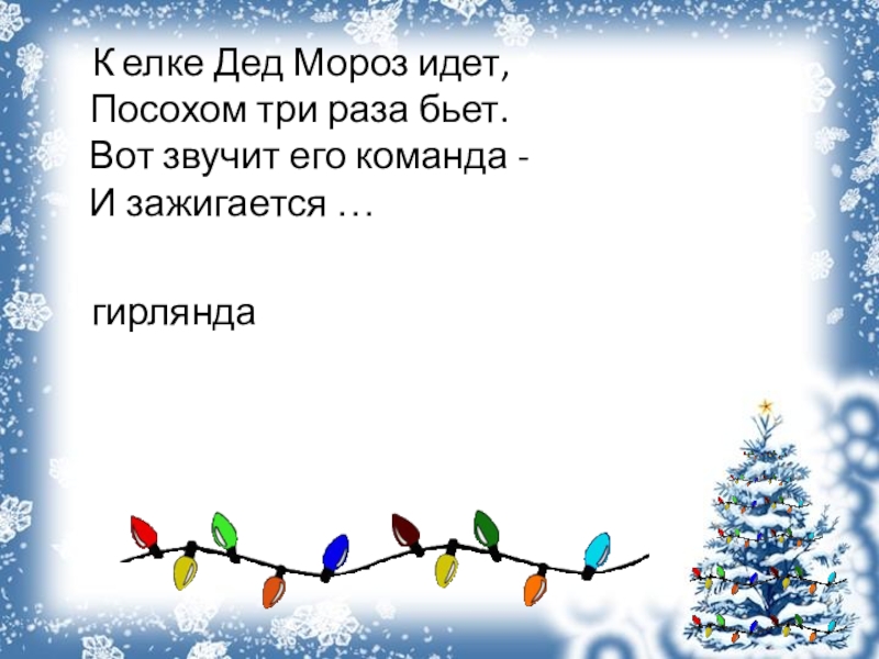 К елке Дед Мороз идет, Посохом три раза бьет. Вот звучит его команда - И зажигается …