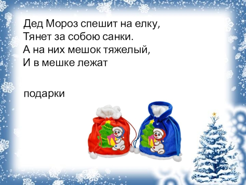 Слайд 5Дед Мороз спешит на елку, Тянет за собою санки. А на них мешок