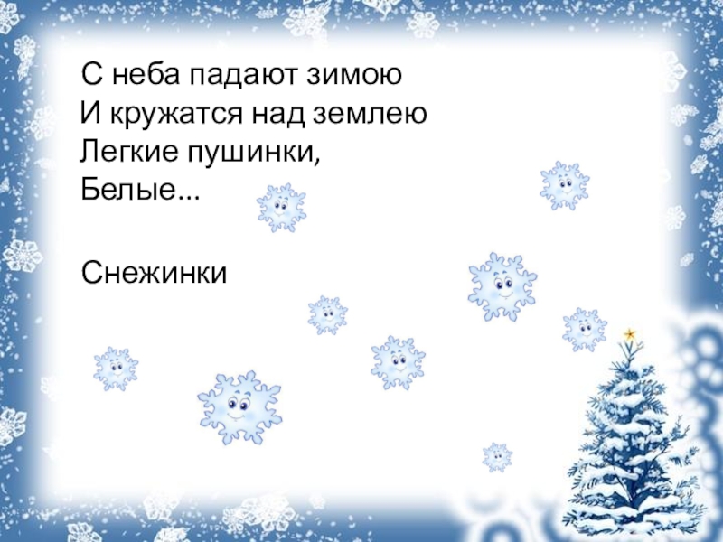 С неба падают зимою  И кружатся над землею  Легкие пушинки,  Белые...  Снежинки