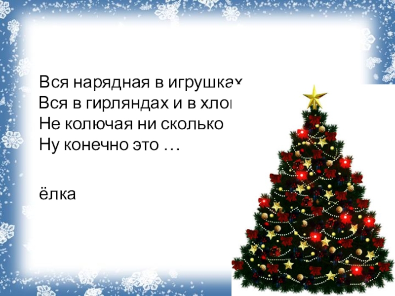 Слайд 10Вся нарядная в игрушках Вся в гирляндах и в хлопушках Не колючая ни