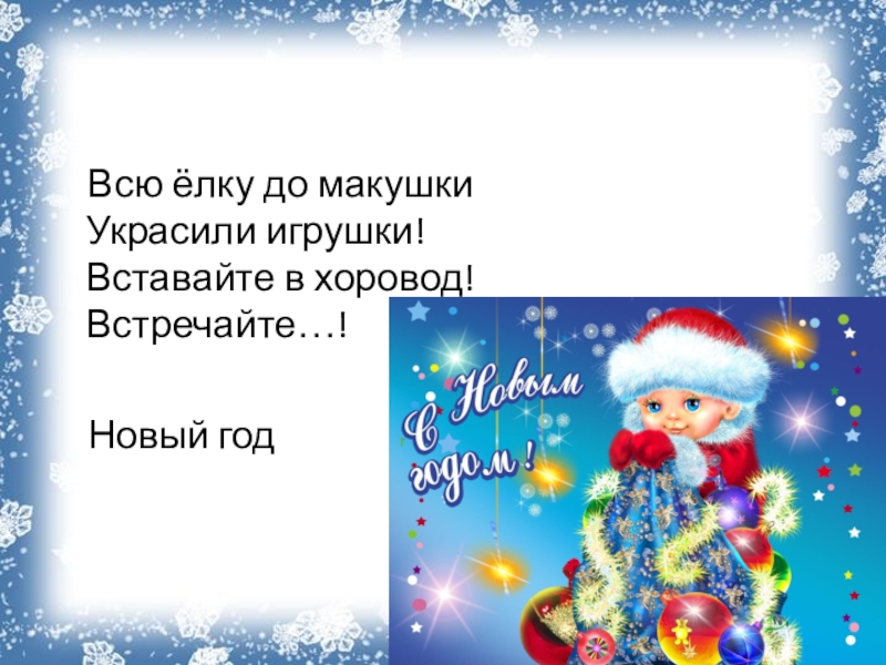 Всю ёлку до макушки Украсили игрушки! Вставайте в хоровод! Встречайте…! Новый год
