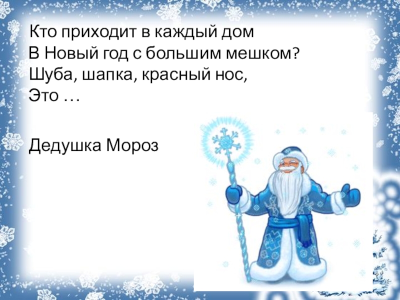 Кто приходит в каждый дом В Новый год с большим мешком? Шуба, шапка, красный нос, Это … Дедушка Мороз