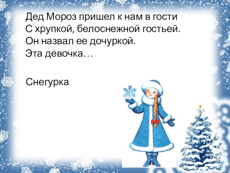 Дед Мороз пришел к нам в гости С хрупкой, белоснежной гостьей. Он назвал ее дочуркой. Эта девочка…Снегурка