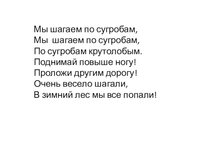 Мы шагаем по сугробам, Мы  шагаем по сугробам, По сугробам крутолобым. Поднимай повыше ногу! Проложи другим дорогу! Очень весело шагали, В зимний лес мы все попали!