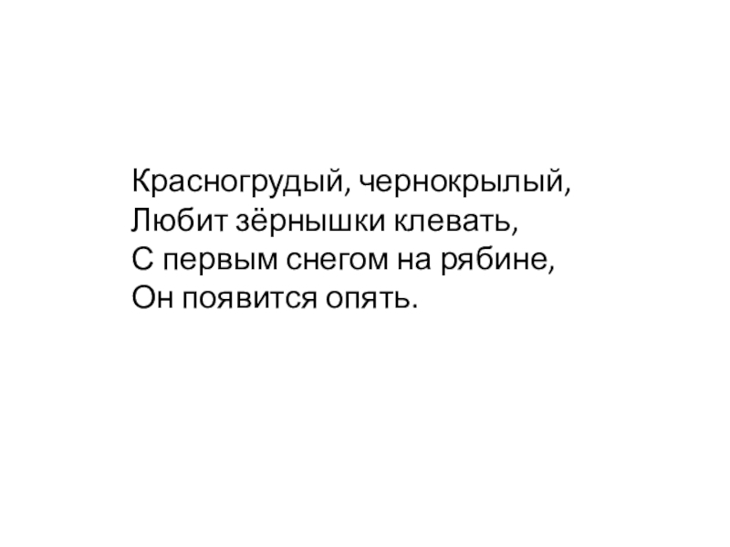 Красногрудый, чернокрылый,		Любит зёрнышки клевать,		С первым снегом на рябине,		Он появится опять.