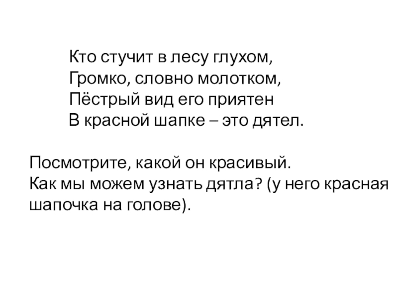 Кто стучит в лесу глухом,		Громко, словно молотком,		Пёстрый вид его приятен		В красной шапке – это дятел.Посмотрите, какой он