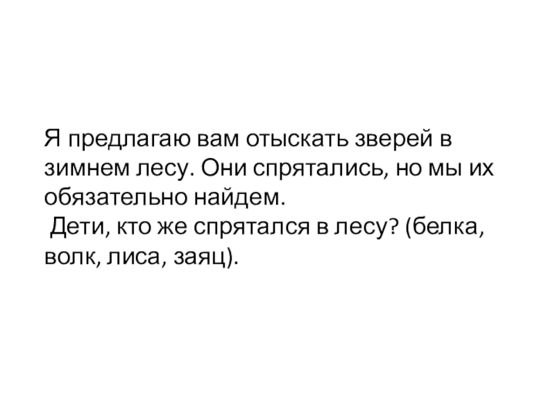 Я предлагаю вам отыскать зверей в зимнем лесу. Они спрятались, но мы их обязательно найдем. Дети, кто же