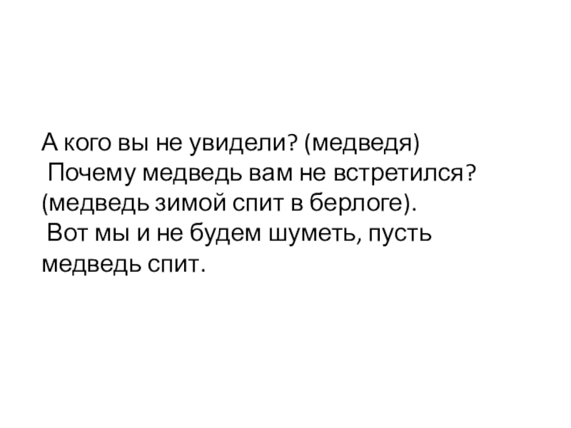 А кого вы не увидели? (медведя) Почему медведь вам не встретился? (медведь зимой спит в берлоге). Вот мы и