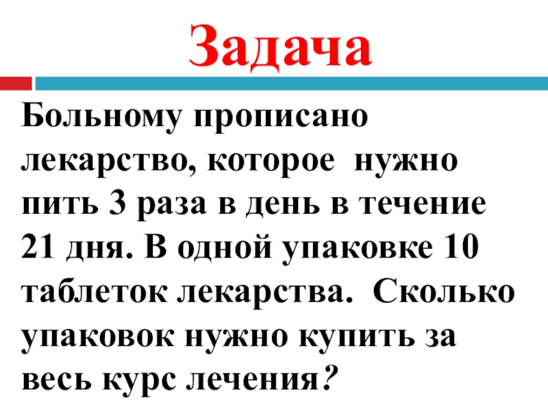 ЗадачаБольному прописано лекарство, которое нужно пить 3 раза в день в течение 21 дня. В одной упаковке