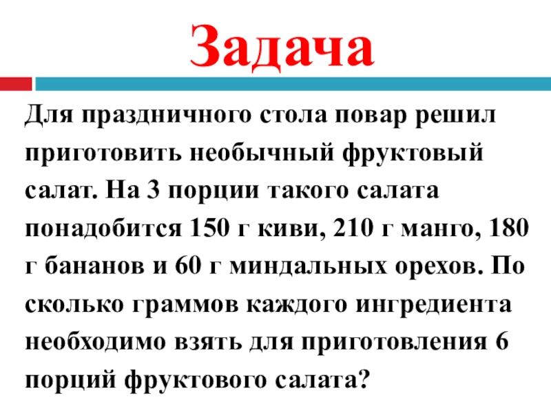 ЗадачаДля праздничного стола повар решил приготовить необычный фруктовый салат. На 3 порции такого салата понадобится 150 г