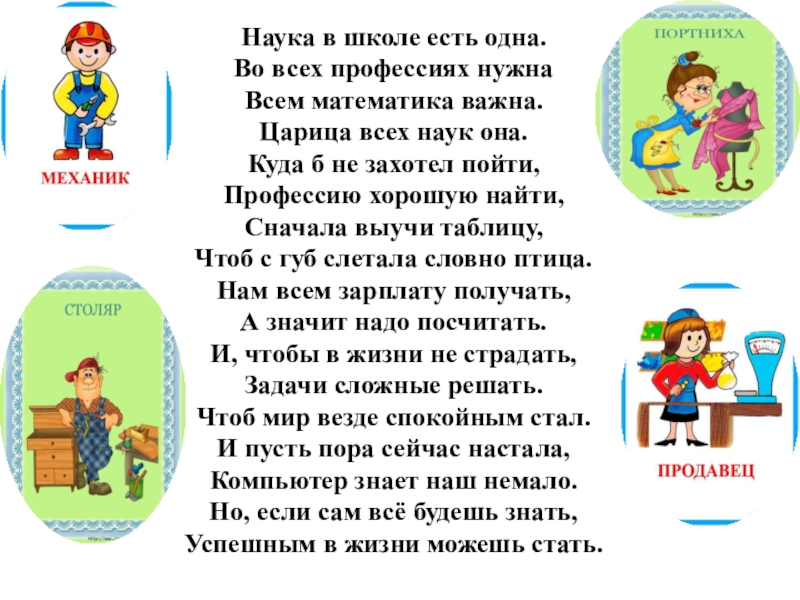 Наука в школе есть одна.Во всех профессиях нужнаВсем математика важна.Царица всех наук она.Куда б не захотел пойти,Профессию