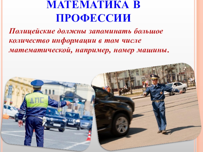 МАТЕМАТИКА В ПРОФЕССИИПолицейские должны запоминать большое количество информации в том числе математической, например, номер машины.