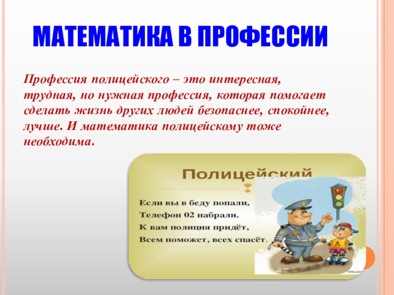 МАТЕМАТИКА В ПРОФЕССИИПрофессия полицейского – это интересная, трудная, но нужная профессия, которая помогает сделать жизнь других людей