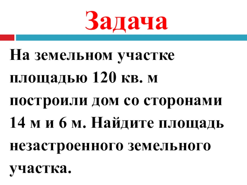 ЗадачаНа земельном участке площадью 120 кв. м построили дом со сторонами 14 м и 6 м. Найдите