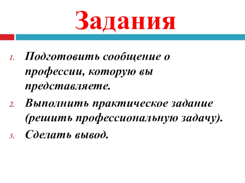 ЗаданияПодготовить сообщение о профессии, которую вы представляете.Выполнить практическое задание (решить профессиональную задачу).Сделать вывод.
