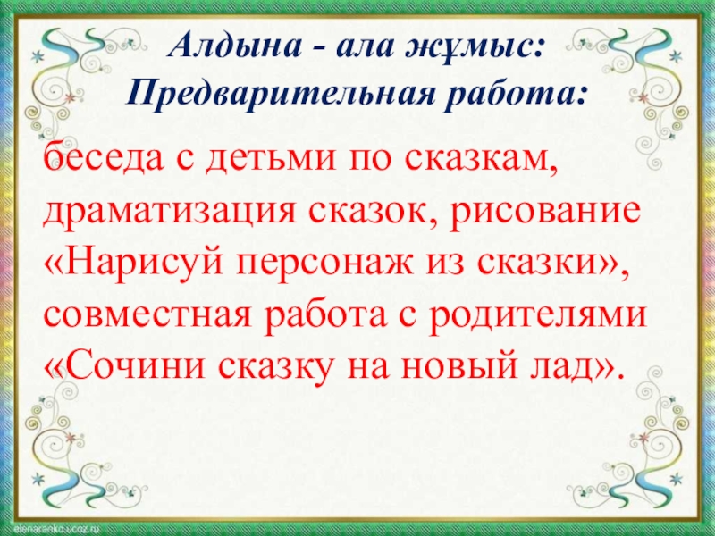 Алдына - ала жұмыс: Предварительная работа: беседа с детьми по сказкам, драматизация сказок, рисование «Нарисуй персонаж из