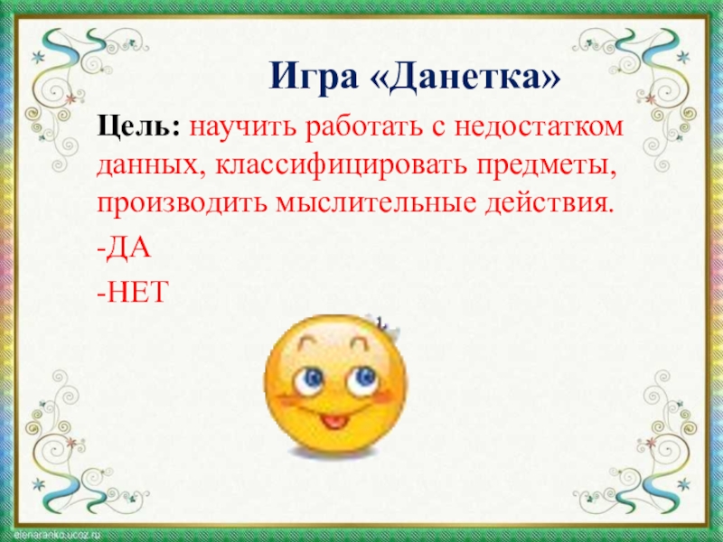 Игра «Данетка»Цель: научить работать с недостатком данных, классифицировать предметы, производить мыслительные действия.-ДА-НЕТ