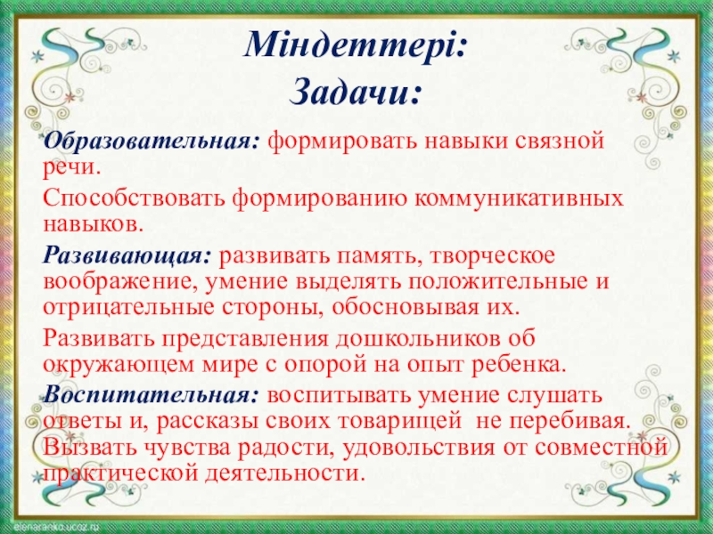 Міндеттері: Задачи: Образовательная: формировать навыки связной речи.Способствовать формированию коммуникативных   навыков. Развивающая: развивать память, творческое