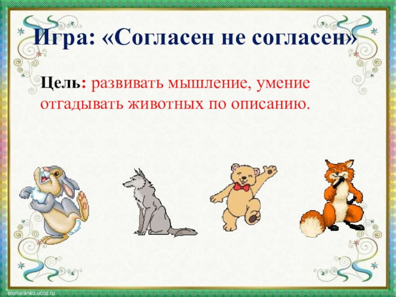 Игра: «Согласен не согласен» Цель: развивать мышление, умение отгадывать животных по описанию.