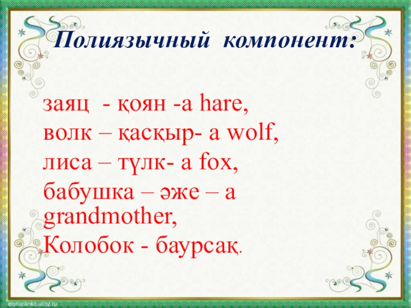 Полиязычный компонент: заяц - қоян -a hare, волк – қасқыр- a wolf, лиса – түлк- a fox,