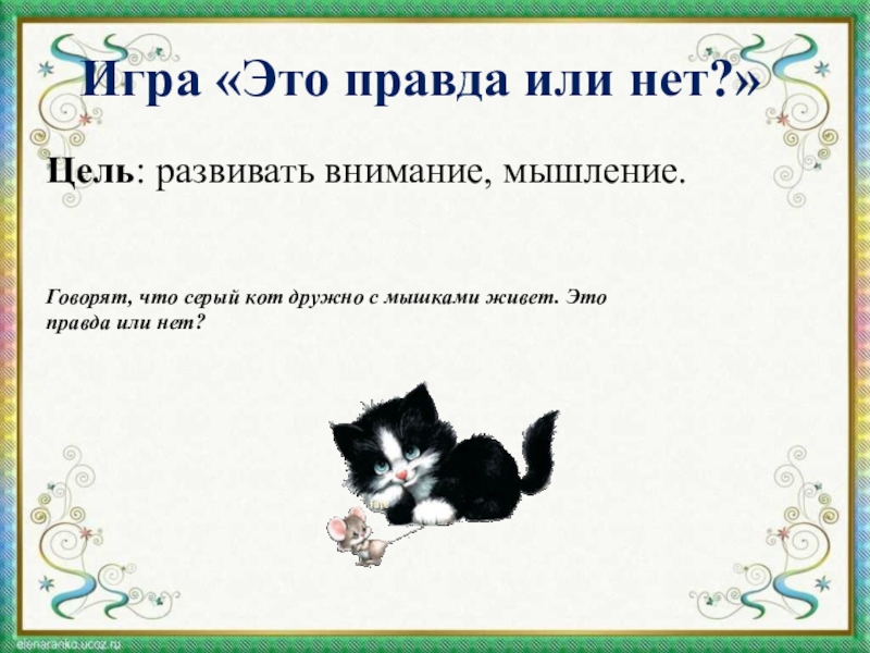 Игра «Это правда или нет?»   Цель: развивать внимание, мышление.Говорят, что серый кот дружно с мышками