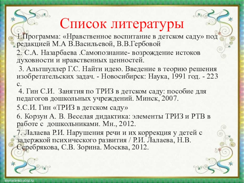 6. Корзун А. В. Веселая дидактика: элементы ТРИЗ и РТВ в работе с  дошкольниками. Мн., 2012.