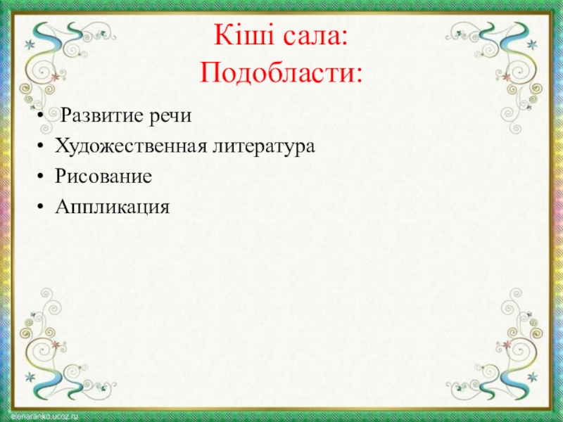 Кіші сала:  Подобласти: Развитие речиХудожественная литератураРисованиеАппликация