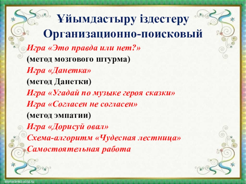 Ұйымдастыру іздестеру Организационно-поисковый  Игра «Это правда или нет?»(метод мозгового штурма)Игра «Данетка»(метод Данетки)Игра «Угадай по музыке героя