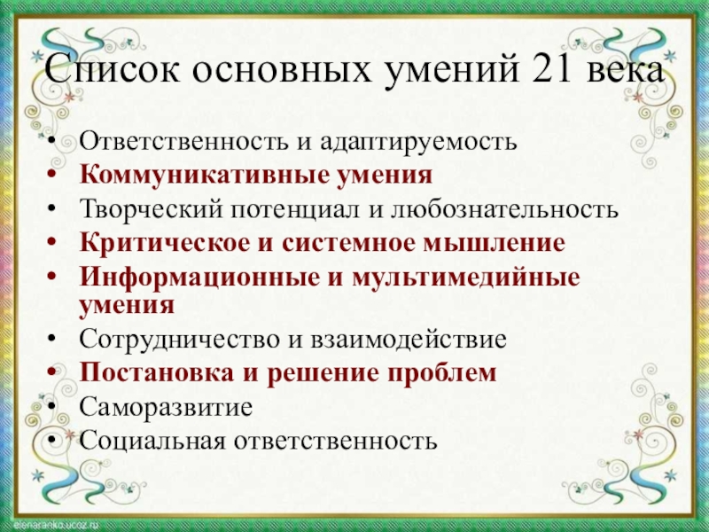 Список основных умений 21 века Ответственность и адаптируемость Коммуникативные умения Творческий потенциал и любознательность Критическое и системное