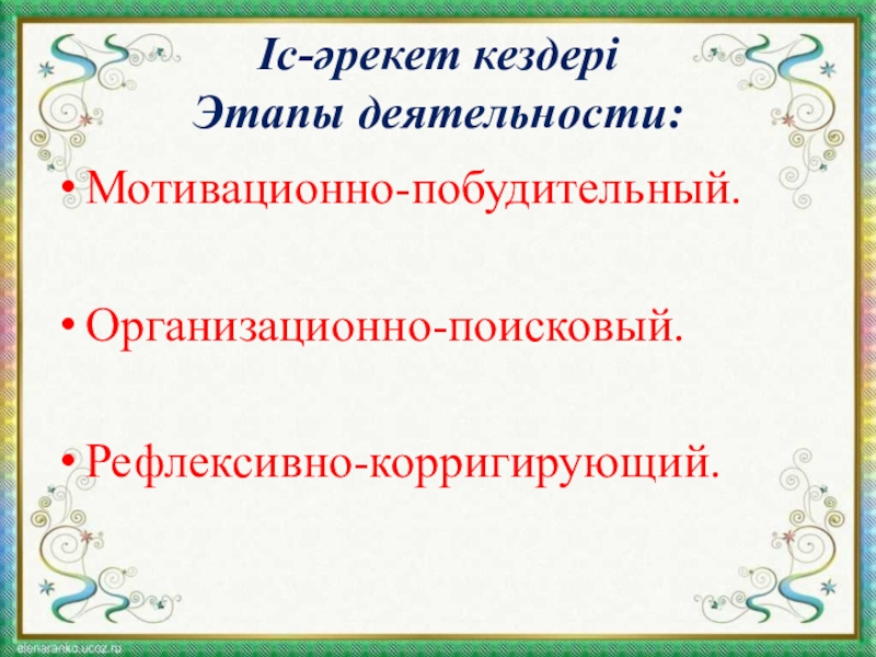Іс-әрекет кездері  Этапы деятельности:Мотивационно-побудительный.Организационно-поисковый. Рефлексивно-корригирующий.