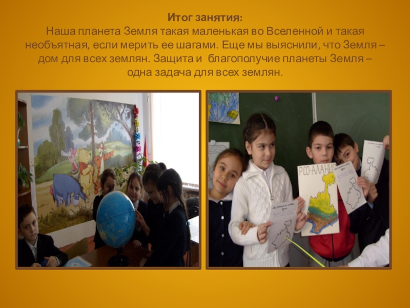 Слайд 14Итог занятия: Наша планета Земля такая маленькая во Вселенной и такая необъятная,