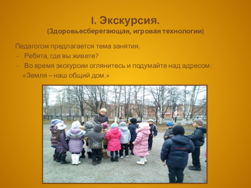 I. Экскурсия. (Здоровьесберегающая, игровая технологии)Педагогом предлагается тема занятия.Ребята, где вы живете?Во время экскурсии оглянитесь и подумайте над