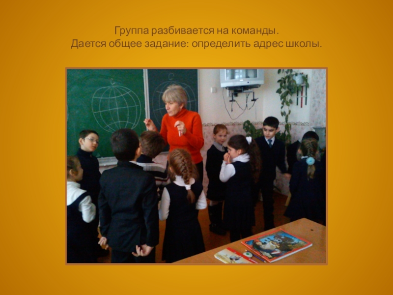 Слайд 7Группа разбивается на команды. Дается общее задание: определить адрес школы.