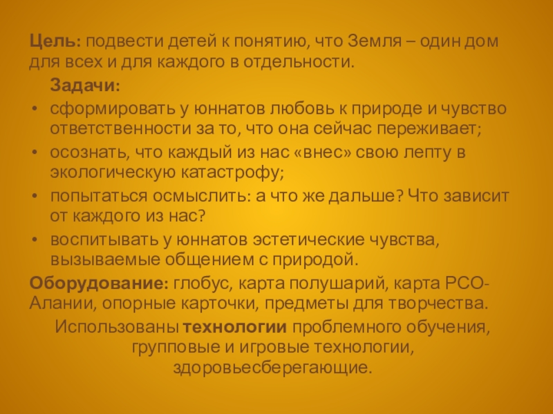 Цель: подвести детей к понятию, что Земля – один дом для всех и для каждого в отдельности. Задачи:сформировать у юннатов любовь к природе и чувство ответственности за то, что