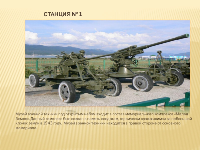 состав мемориального комплекса «Малая Земля». Данный комплекс был создан в память солдатам, героически сражавшимся за небольшой клочок земли в 1943 году. Музей военной техники находится в правой стороне от основного мемориала.