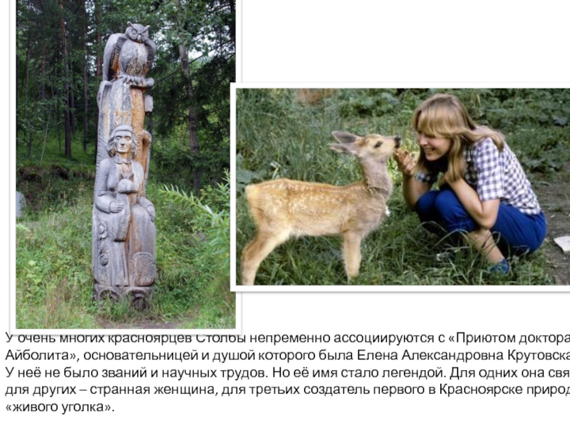 для волка, медведя, оленя и множество птиц, живущих в сторожке. Тогда, в начале 50-х здесь появился олененок Таныш – хрупкое двухмесячное существо, привезенное из леса. Из лосенка Лоськи хотели сделать чучело, да слишком замученным он показался, вот и отдали его зоологу. Умирающего волчонка нашли охотники в норе. Выпавших из гнезда птенцов приносили мальчишки. Парализованную сороку притащили туристы. Множество птиц летало по комнатам: попугаи, ворона, сорока, зяблик. Маленький глухарь Фитька любил спать на подушке Елены Александровны. Лось, марал, олень выходили, звеня колокольчиками, на прогулку под охраной Волчика – полуволка-полусобаки. Волчик бегал по двору без цепи, никого не трогая, да никто его и не боялся, пока один злобный пьяный человек не ударил зверя ножом. После этого волка пришлось посадить на цепь. В «Приют доктора Айболита» попадали больные, израненные, одинокие зверушки, с которыми делилась лаской и заботой Елена Крутовская и её помощники.